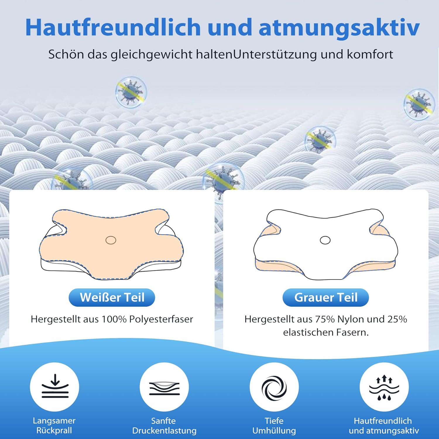 Das Innenleben besteht aus hochwertigem Memory-Schaum, der sich deiner Kopfform individuell anpasst. Der Bezug ist atmungsaktiv, hautfreundlich und waschbar – perfekt auch für sensible Schläfer:innen.