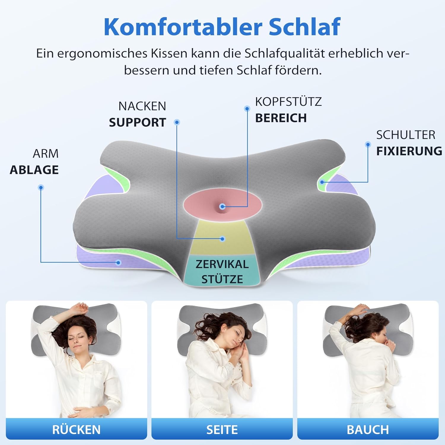 Normale Kissen bieten oft zu wenig gezielte Unterstützung. Unser ErgoDream™ wurde ergonomisch entwickelt, um Nacken, Schultern und Wirbelsäule optimal auszurichten – für spürbar erholsameren Schlaf und weniger Schmerzen.